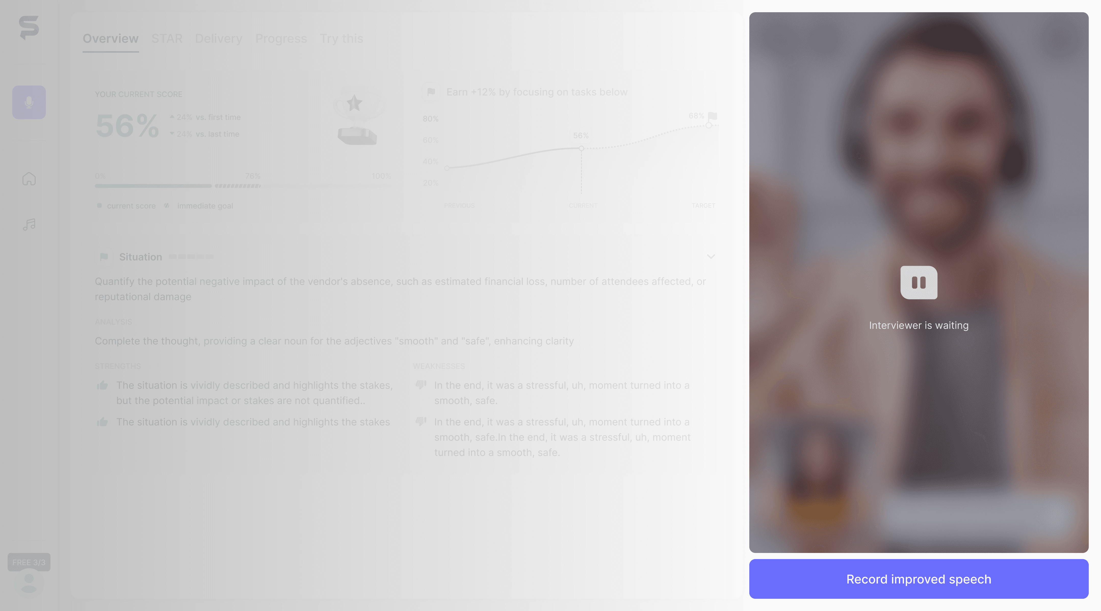 I redesigned the screen to mimic a real interview environment. This forces the user to posture up and manage their presence, while giving them full control over the topic.