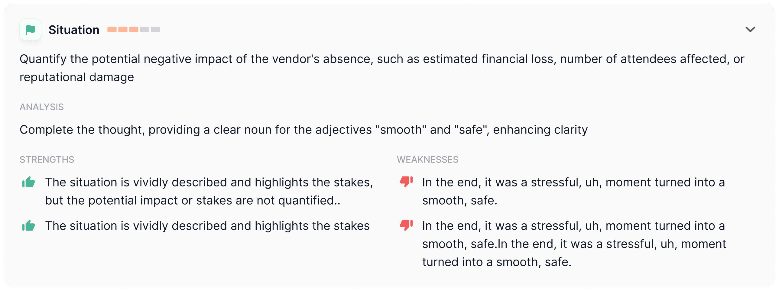 The user must technically improve (better structure, less filler words).
