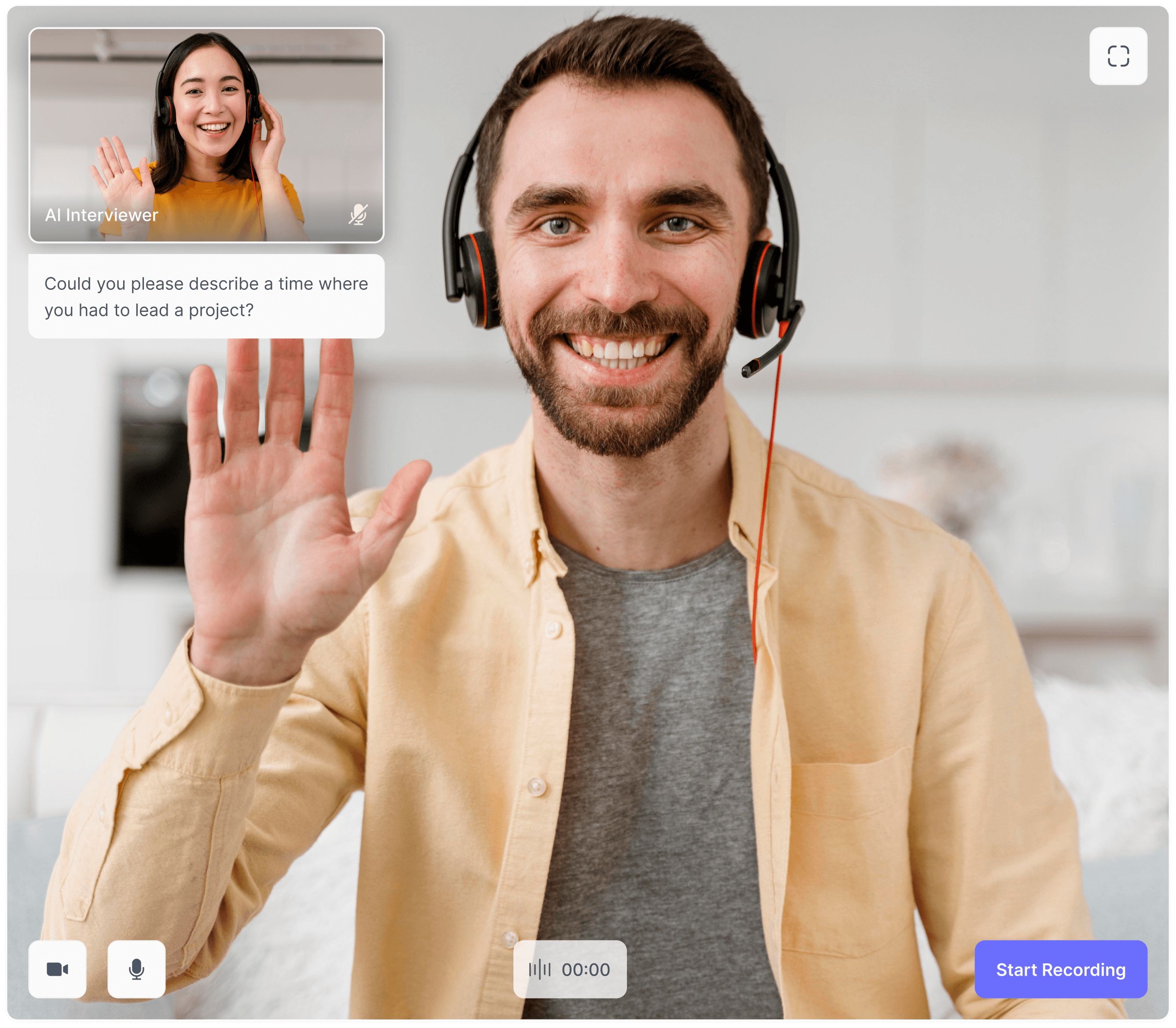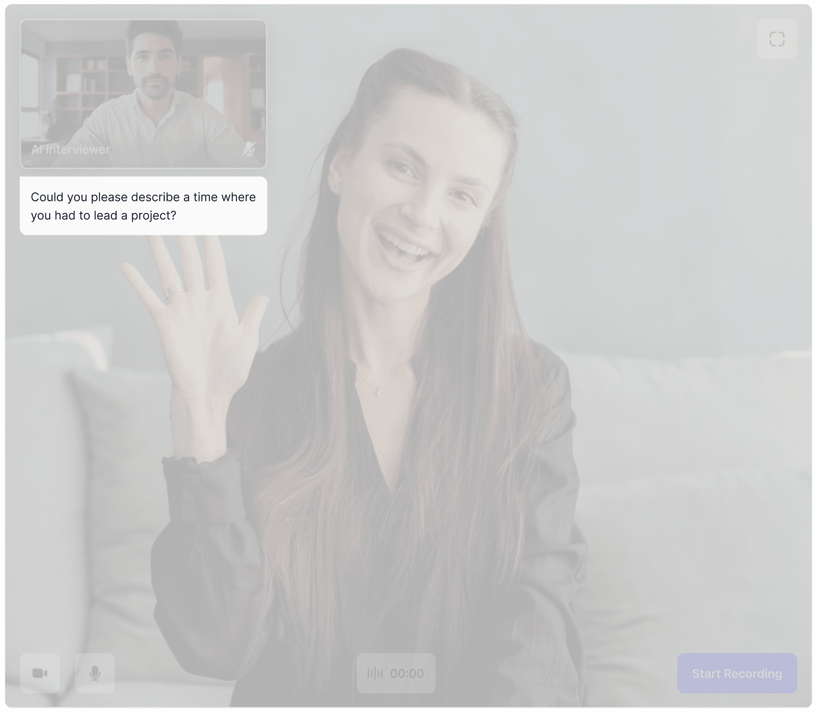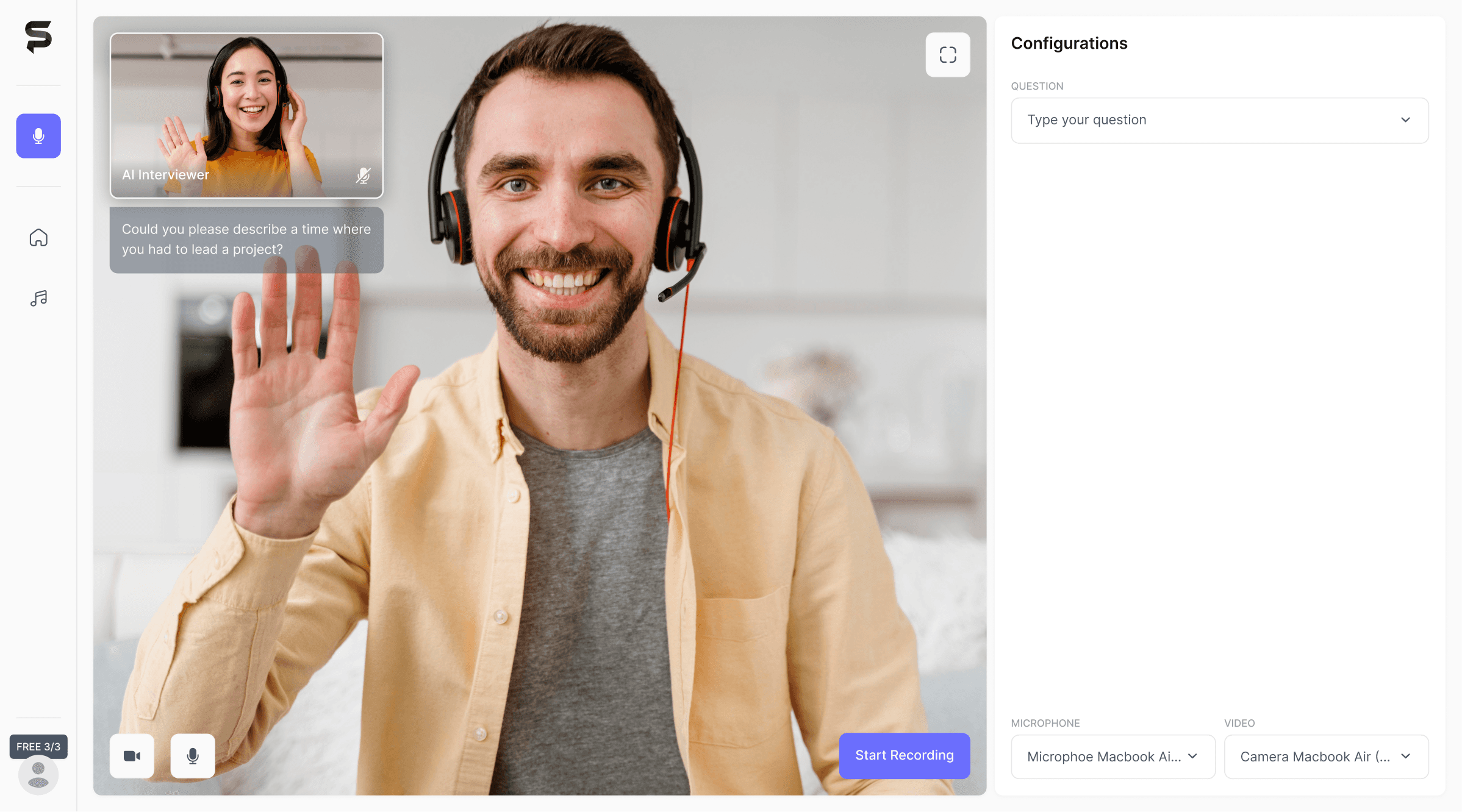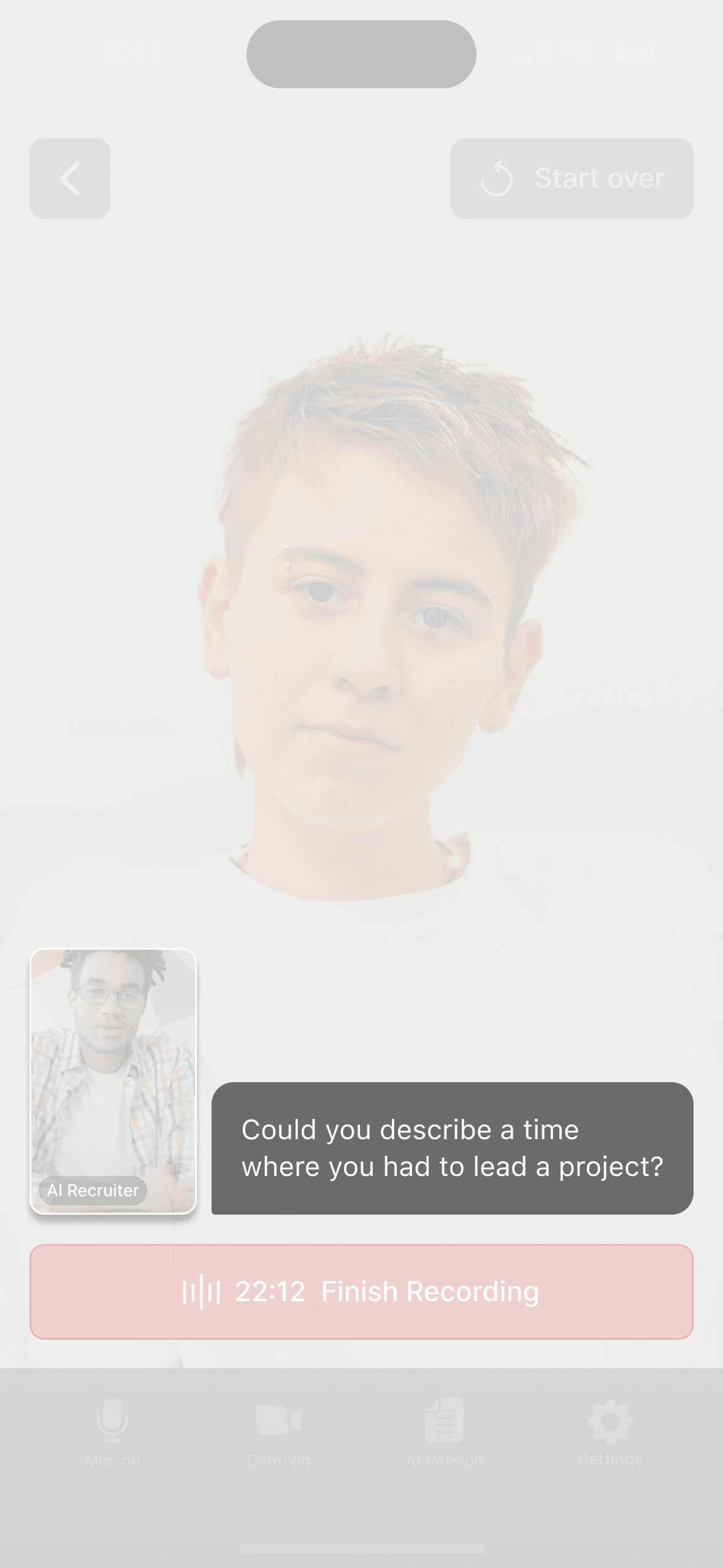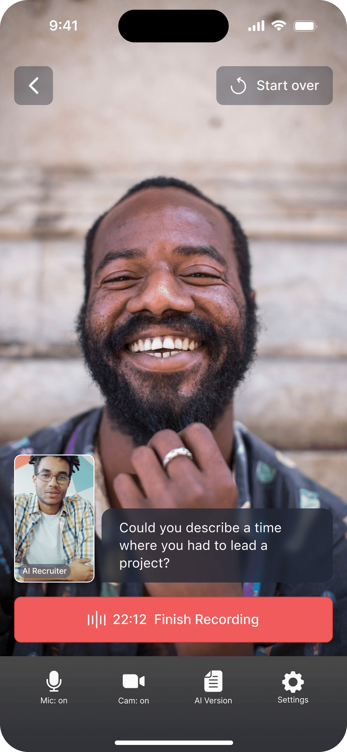 I redesigned the screen to mimic a real interview environment. This forces the user to "posture up" and manage their presence, while giving them full control over the topic.