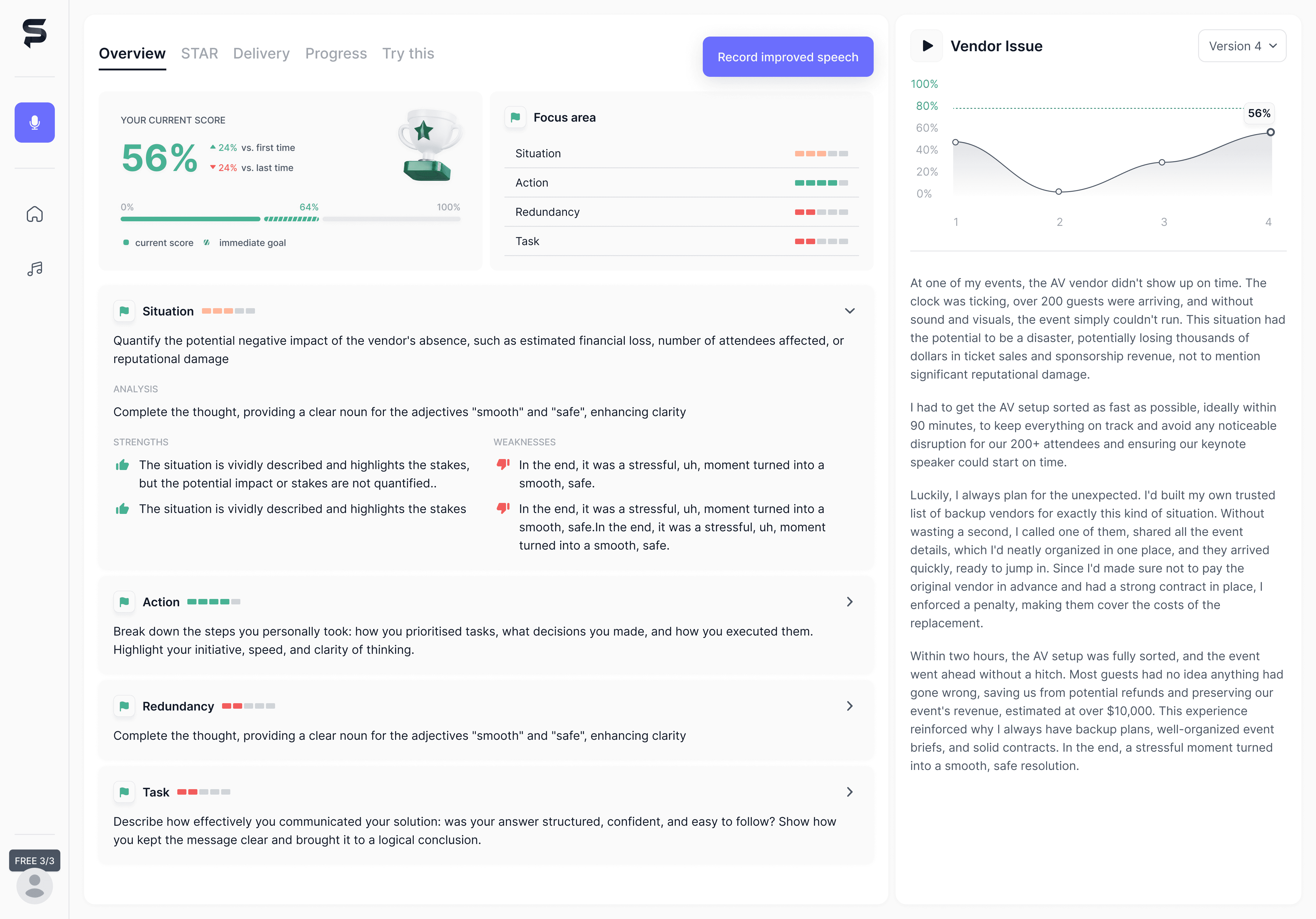 I completely restructured the screen to direct all attention to re-recording. The interface now hides the details and highlights a single, high-impact task, gamifying the improvement process.