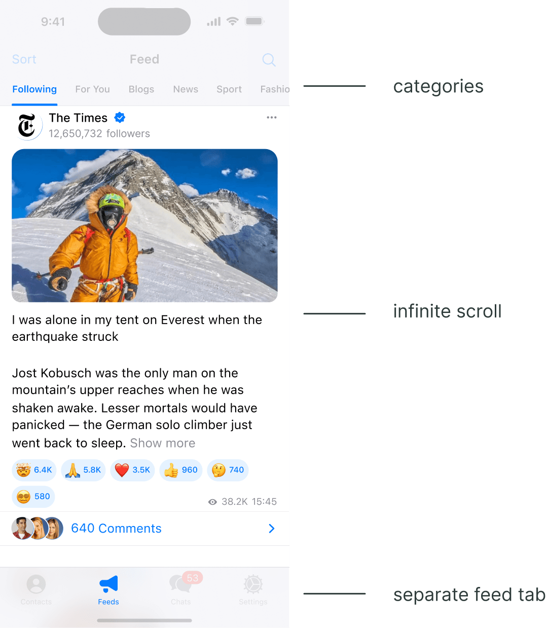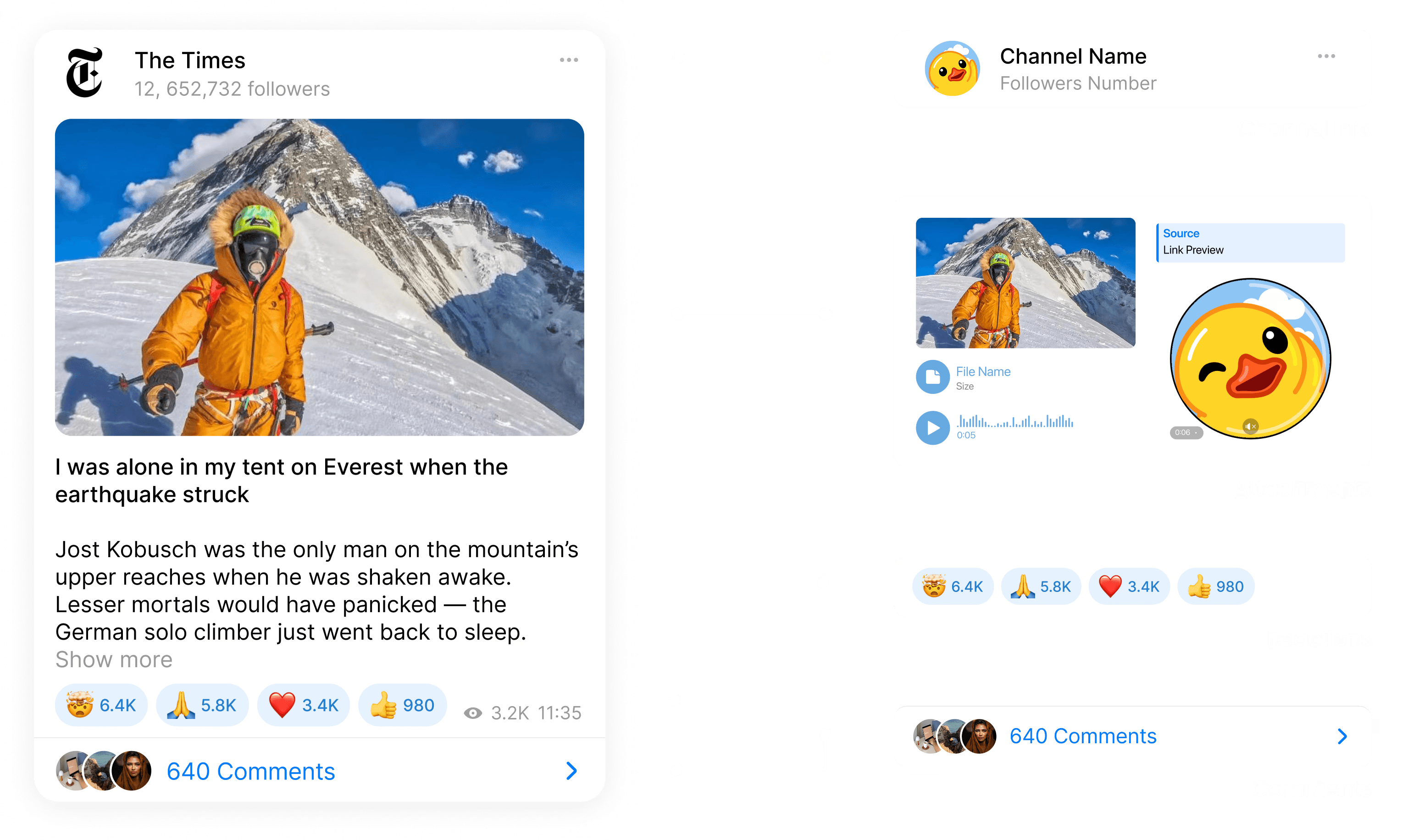 Feed cards retain all original attachments and attributes (reactions, media), condensed into a smart preview to save vertical space