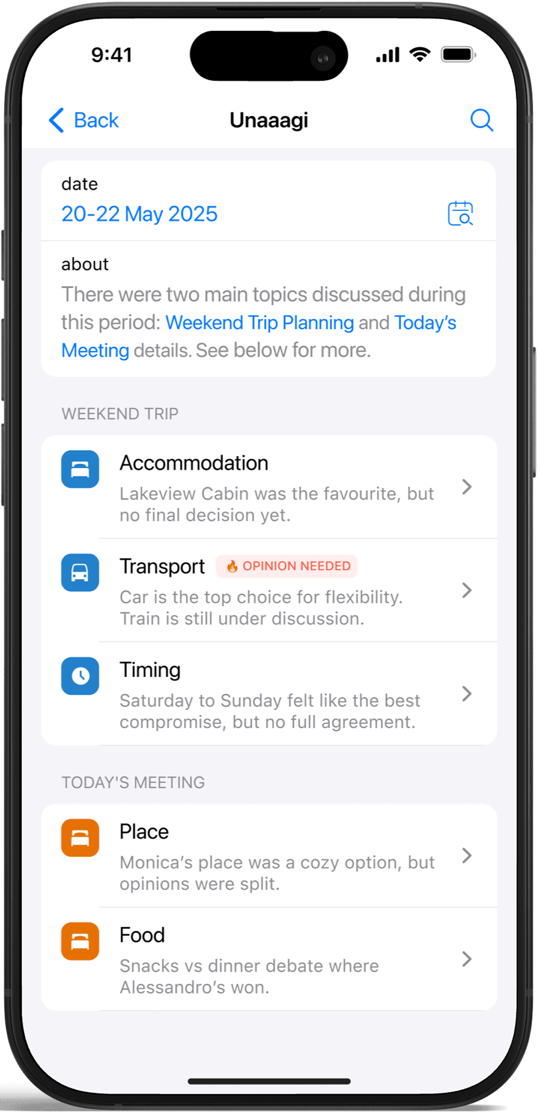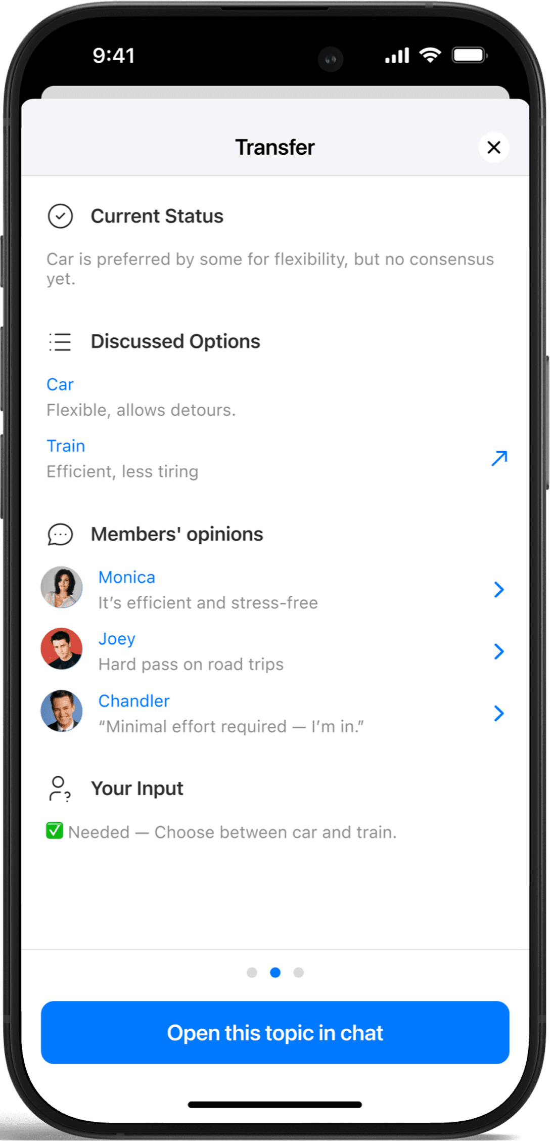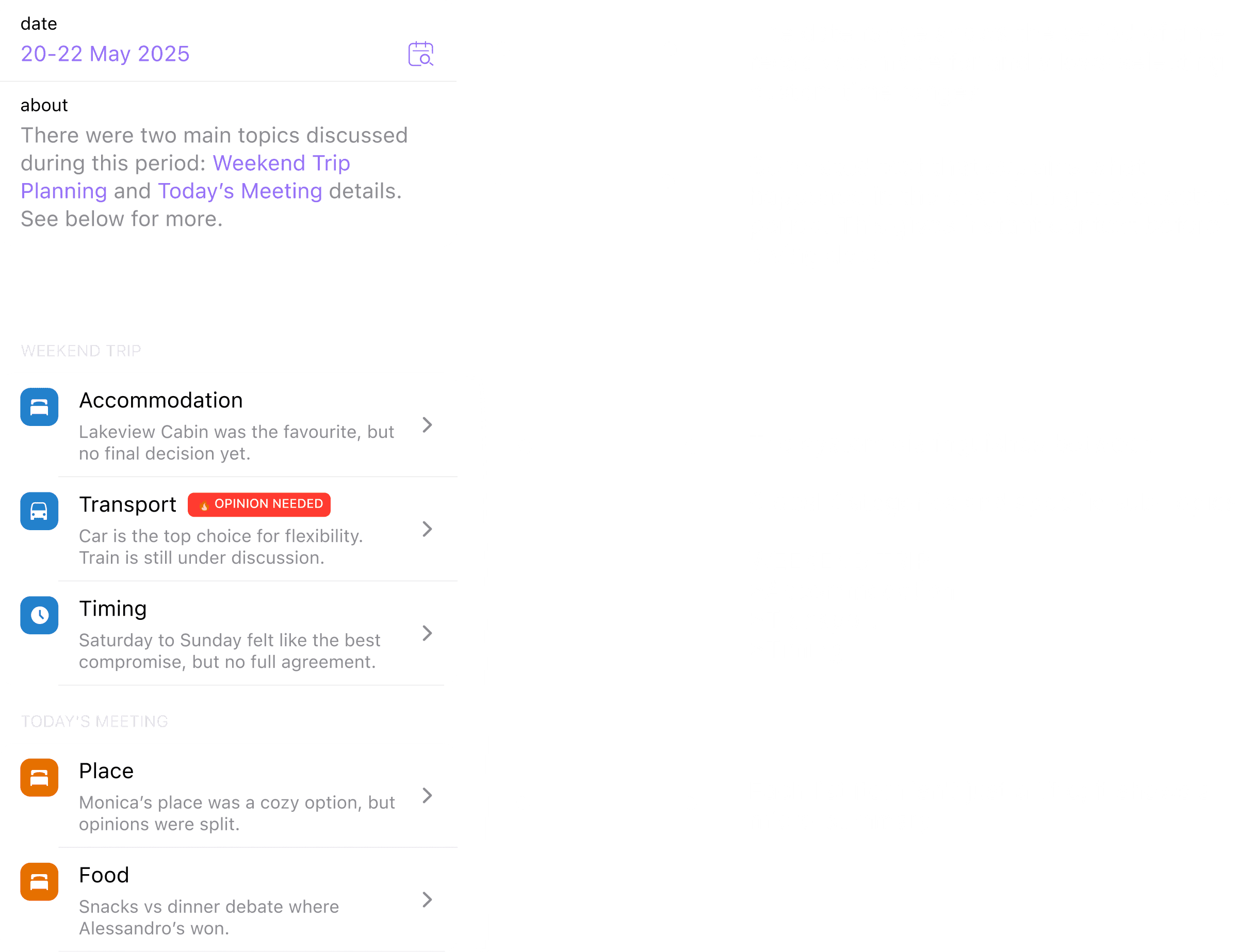 Instead of just summarising text, I designed an AI layer that parses the conversation and restructures it into Topic Cards.