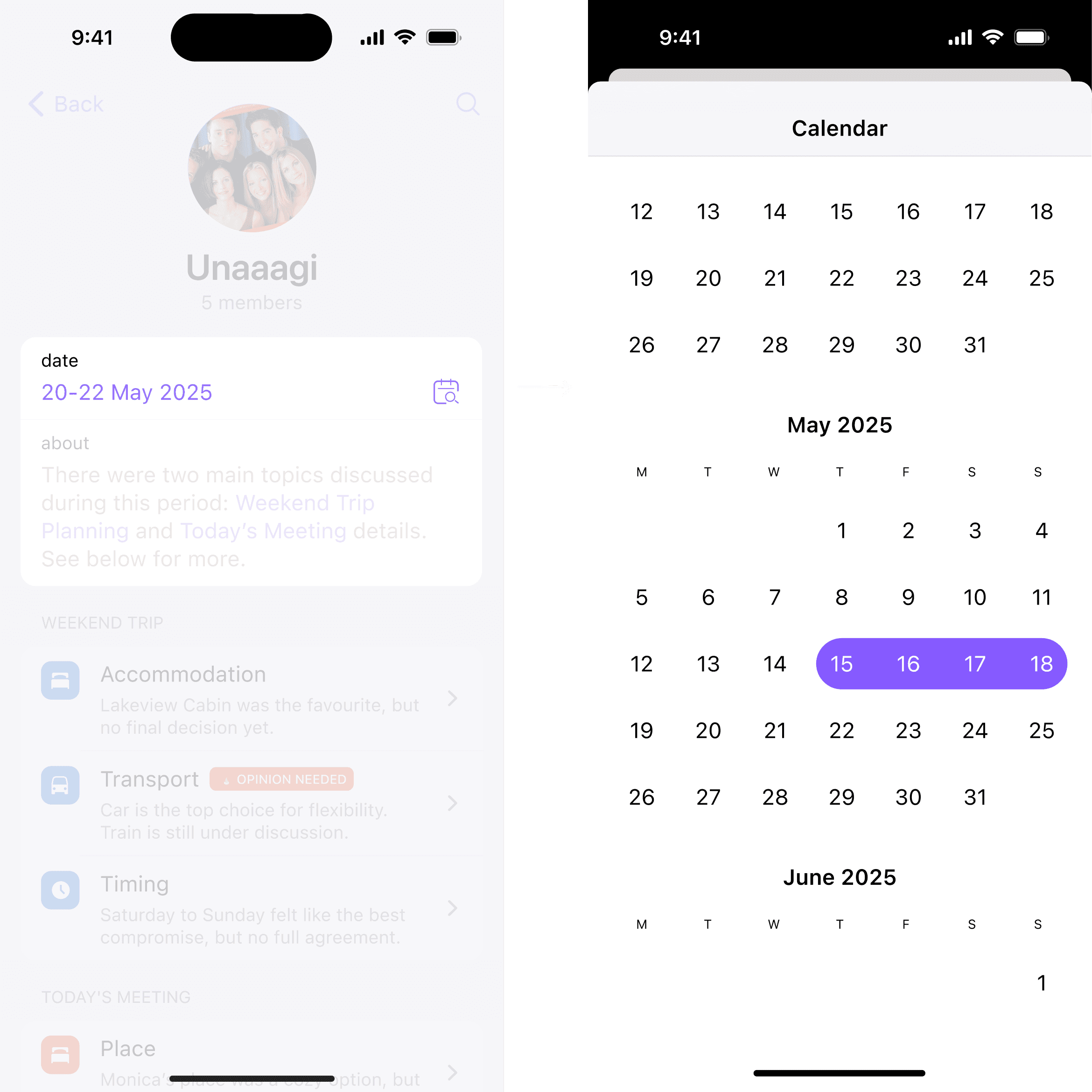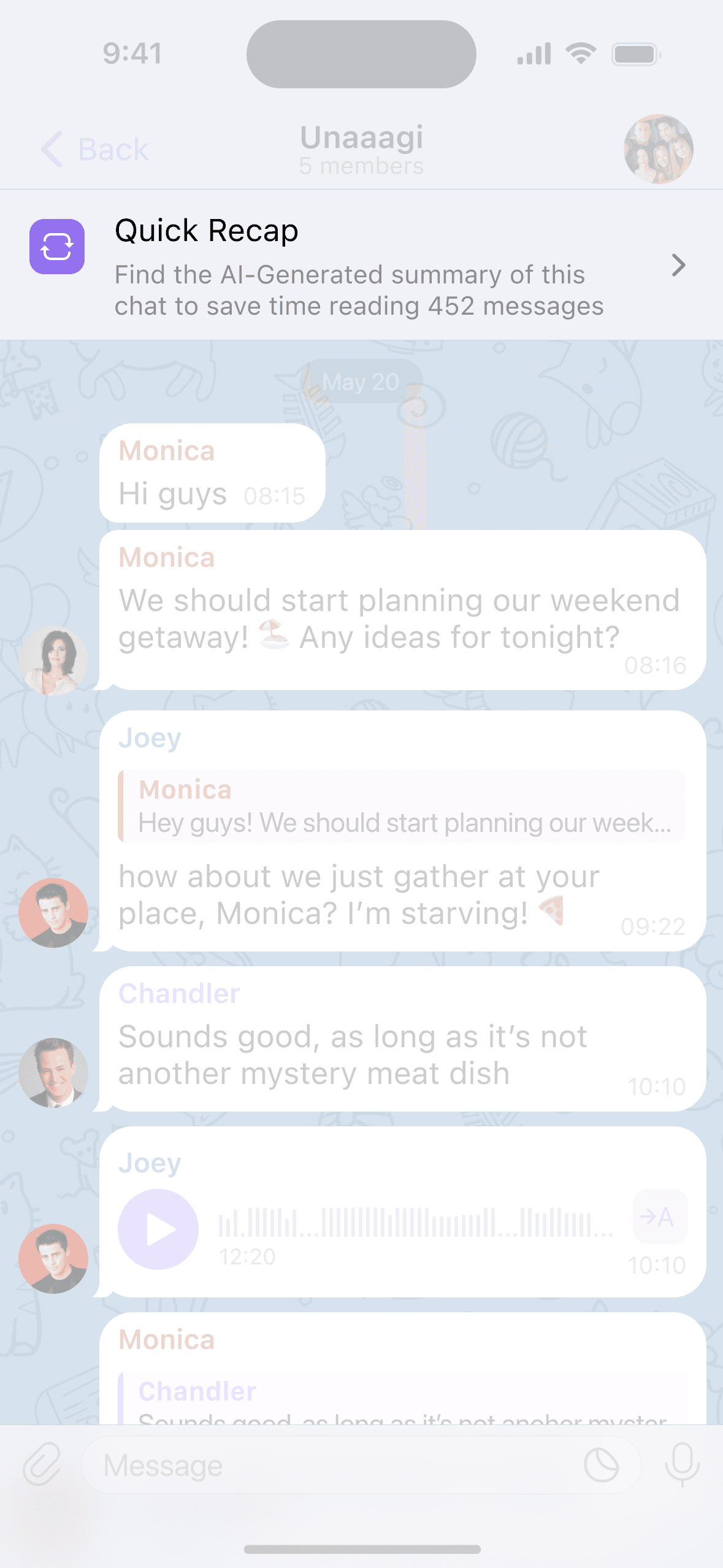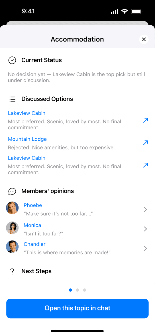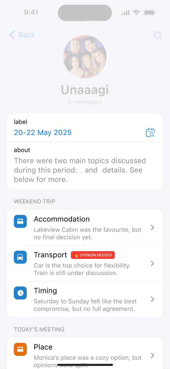 For users who want to find a summary of a past event (e.g., "What did we decide last Tuesday?"), I placed a permanent entry point in the Group Info menu.