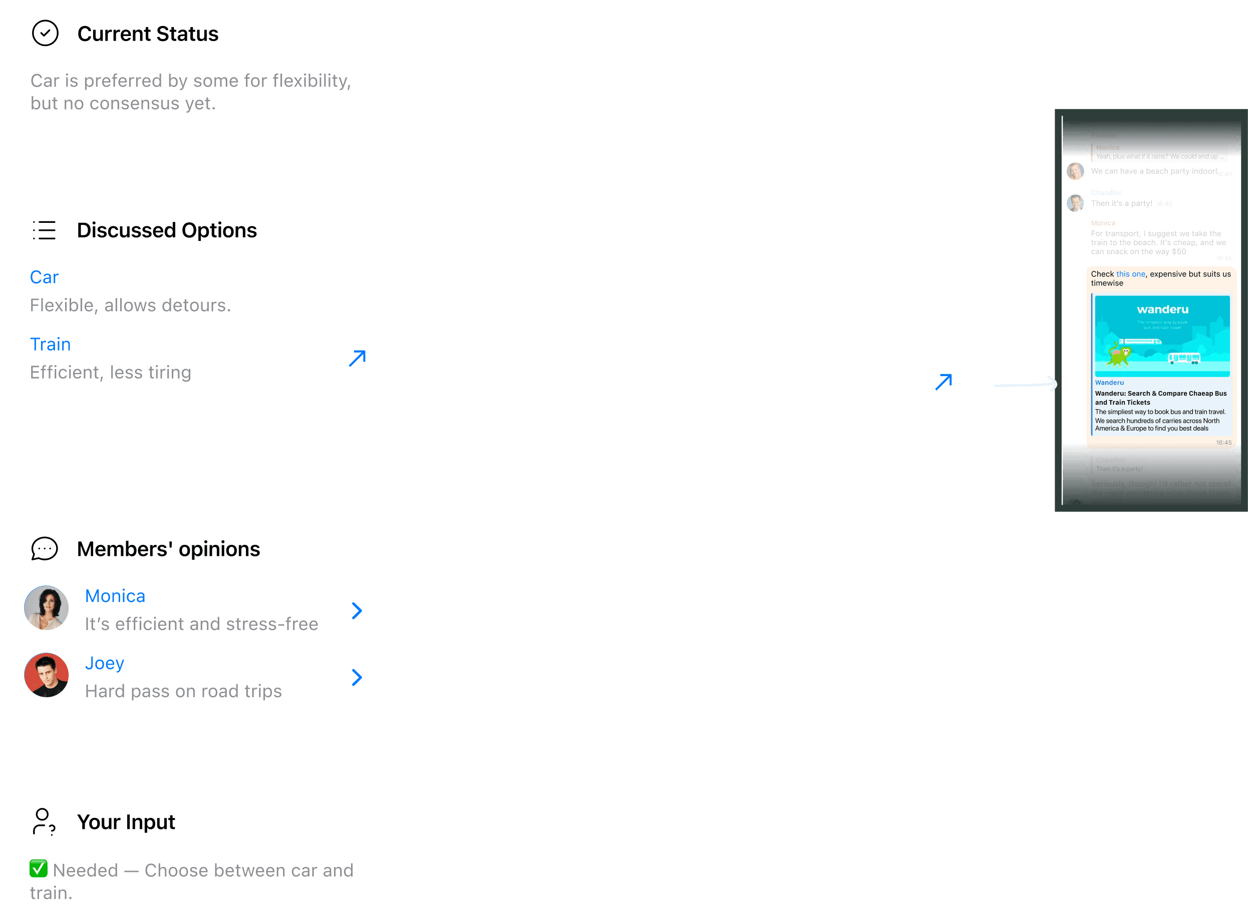 The user transitions from a cluttered chat stream into a structured, distraction-free interface, and then dives deep into specific decisions.