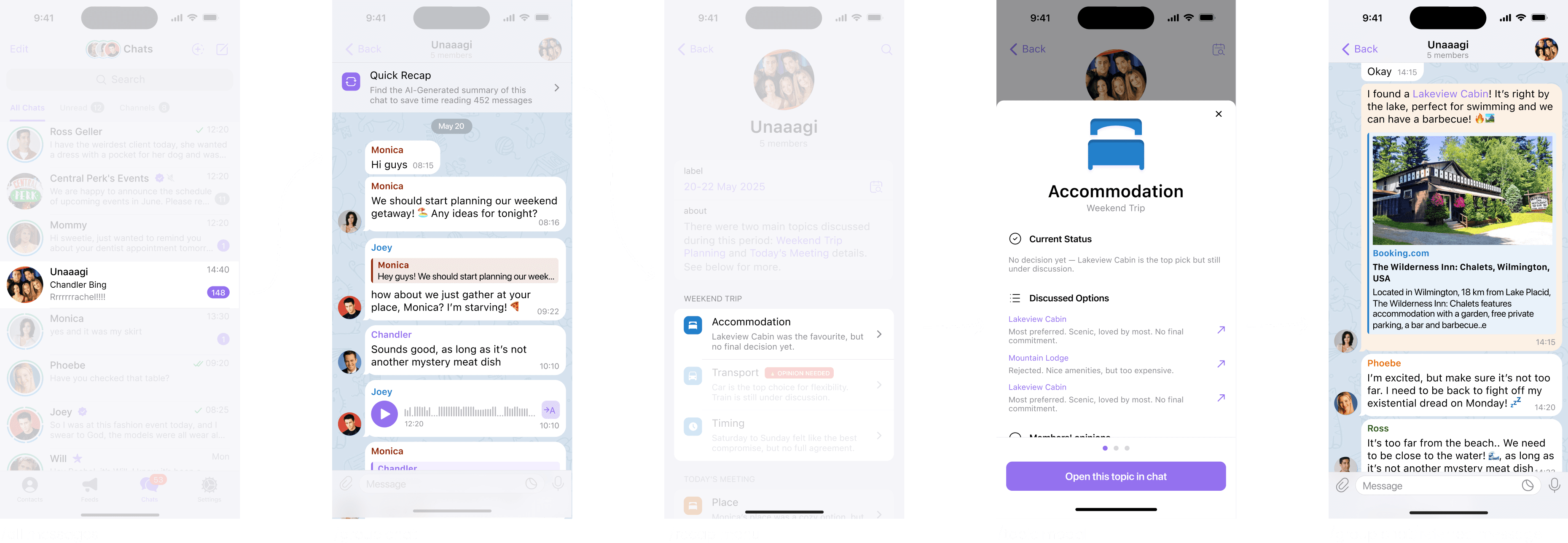 The AI automatically groups related messages (e.g., links to AirBnB, discussions about prices) into a single "Accommodation" card, regardless of when they were sent.