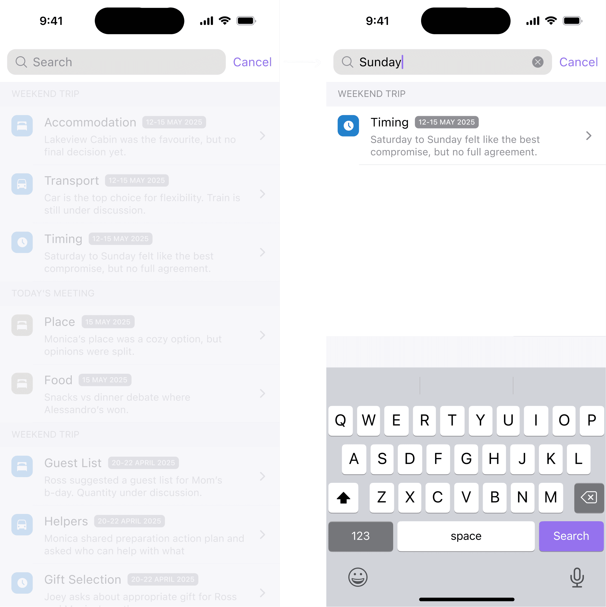 Unlike standard keyword search, this feature finds topics. Searching for 'Sunday' reveals the entire 'Timing' context instantly